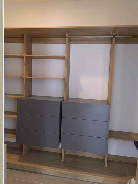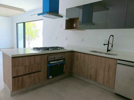 Cocina integral con cubiertas de cuarzo y lavavajillas.