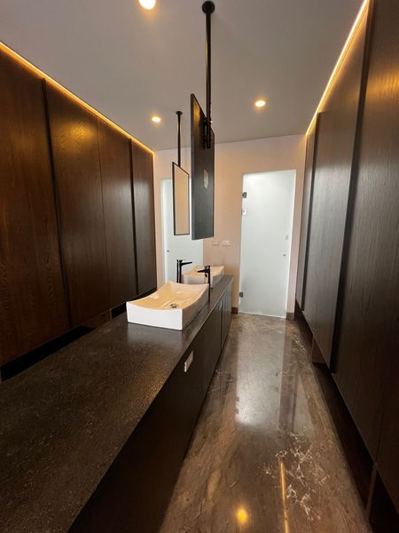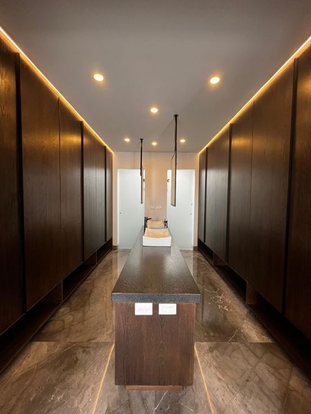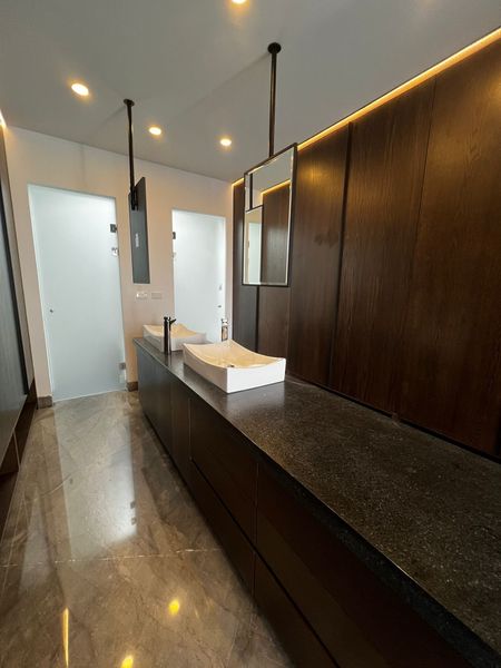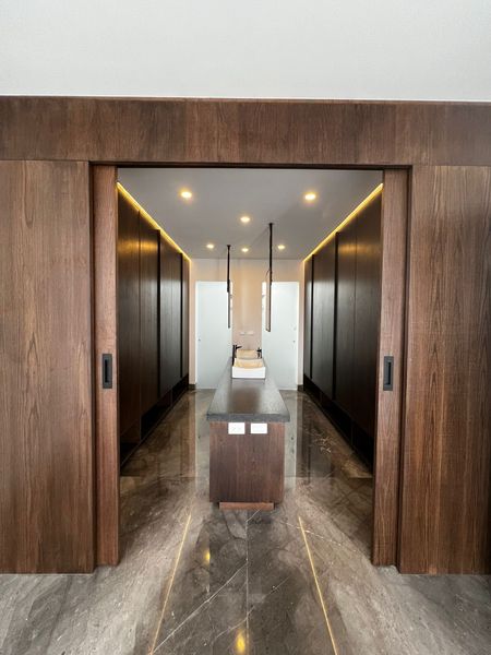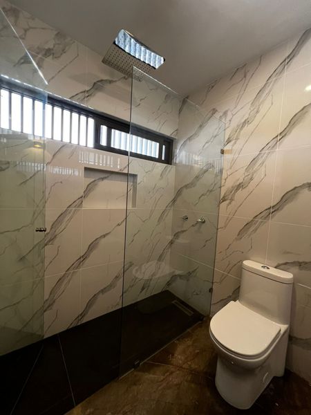 • Muros baños: Recubrimiento de Porcelanato Calacatta Gran Formato (1.2x0.60m) • Barras muebles de Baño: Granito Negro San Gabriel en Acabado Leather.