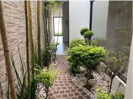 area de lavado, cuarto de servicio con baño completo, pisos de porcelanato, jardín con sistema de riego por aspersión.