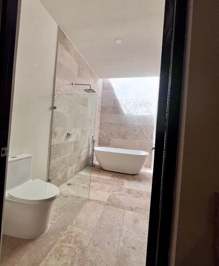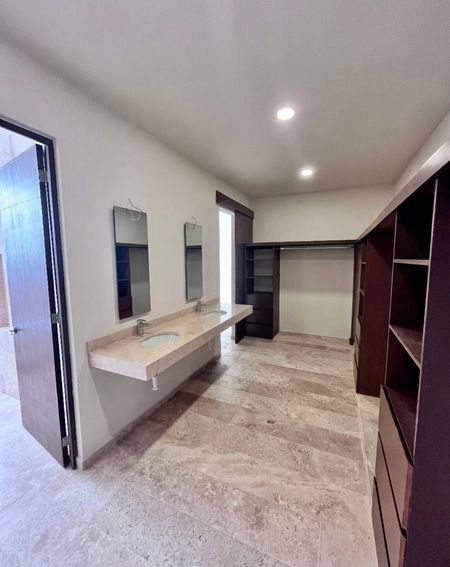 Recámara principal con clóset-vestidor y baño completo propio con 2 lavabos y área de ducha y tina.
