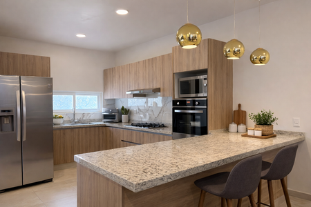 *La casa tiene una modificación en la cocina (la barra más amplia) baño completo en tercer nivel y techo completo en roof garden.