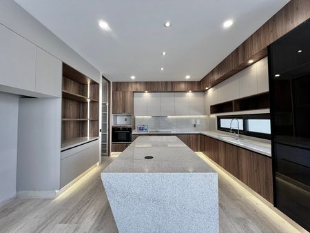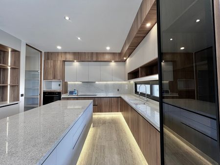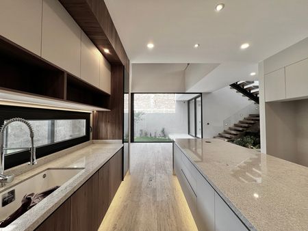 La cocina está equipada con acabados elegantes, excelente espacio de trabajo y una alacena de gran tamaño que brinda una solución perfecta de almacenamiento. Además, la planta baja incluye área de lavado, cuarto de servicio con baño completo y entrada independiente, así como una sala interior acogedora para momentos más privados.