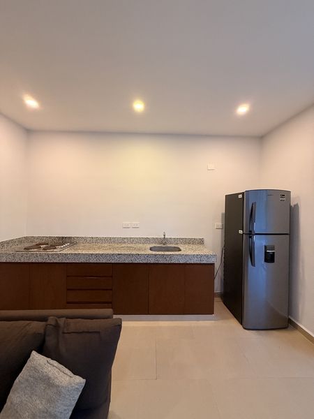 La cocina viene con barra de granito, parrilla eléctrica, tarja, refrigerador y gavetas inferiores.