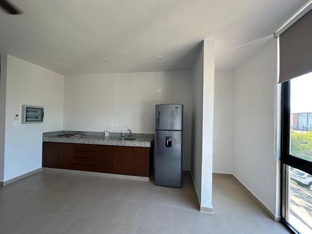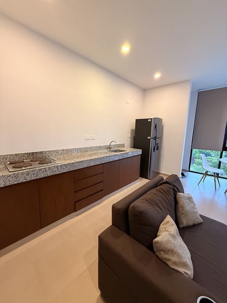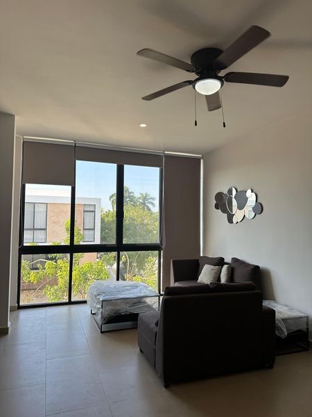 Se renta departamento completamente amueblado en el complejo Taiga, ubicado en una de las mejores zonas de Mérida, en Montebello. Cuenta con seguridad y acceso controlado 24h, piscina, bar, área social climatizada con televisión, sofá y mesas.