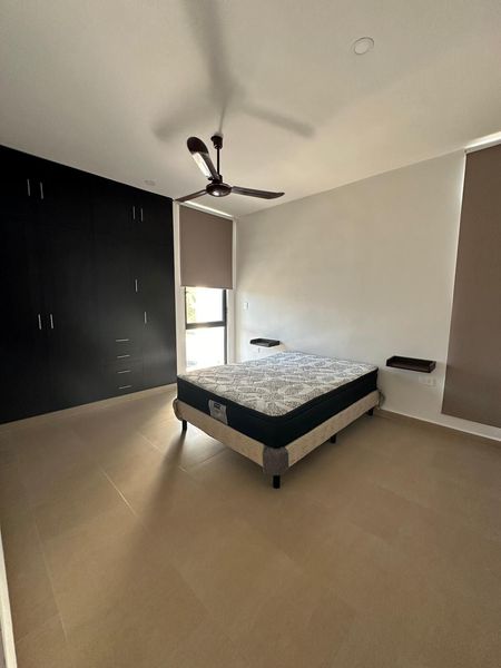 1 habitación con cama matrimonial clóset, ventilador, aire acondicionado y persianas blackout.