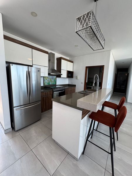 Cocina integral equipada con refrigerador, estufa con campana y barra desayunadora.