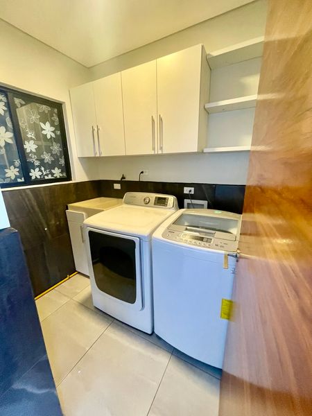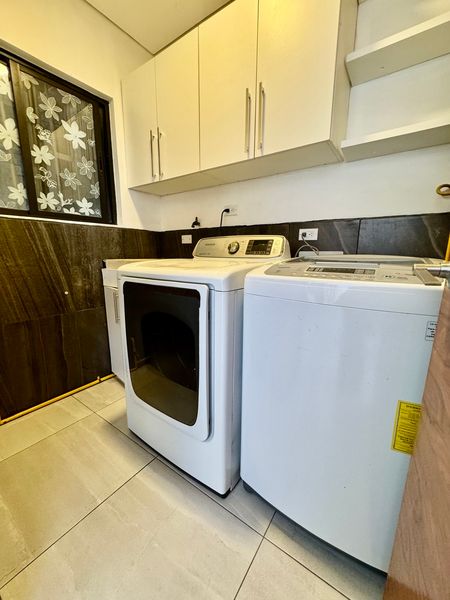 Cuarto de lavado con lavadora, secadora, lavadero y estantes para almacenamiento.