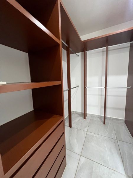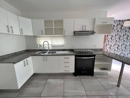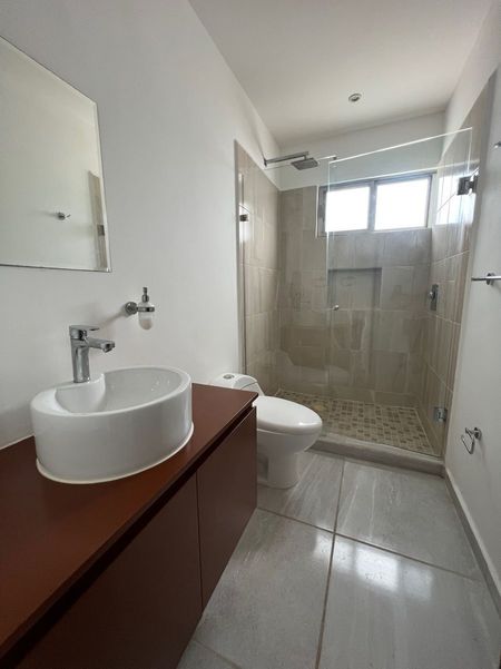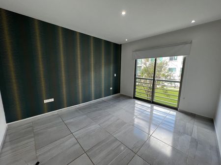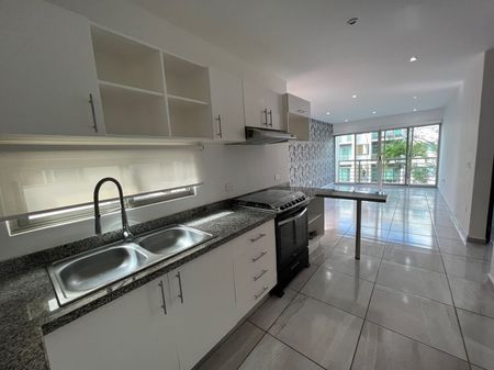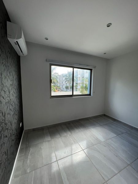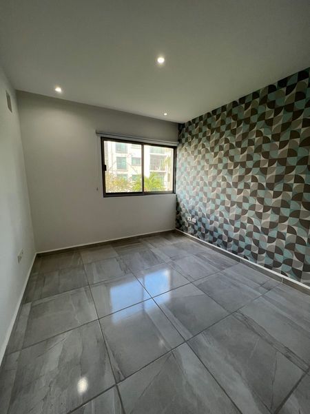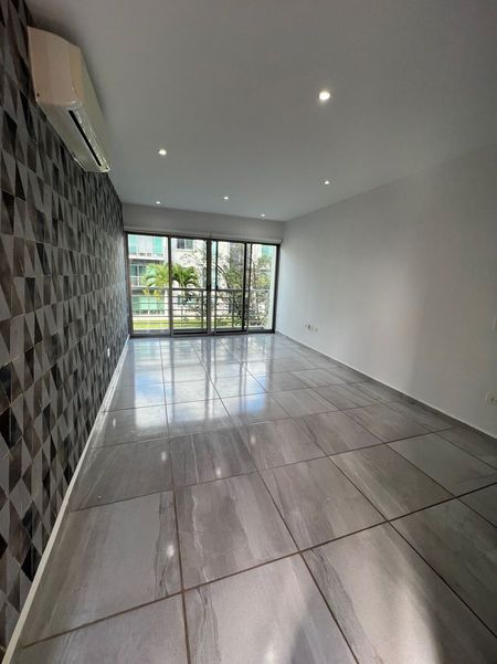 Departamento de 110m2, en primer nivel, sala con terraza al jardín, comedor, cocina integral, cuarto de lavado, estancia, dos recámaras secundarias con closet compartiendo un baño completo, recámara principal con closet vestidor y baño completo, aire acondicionado en todo el departamento, persianas, dos estacionamientos, alberca, área infantil, doble caseta de seguridad.