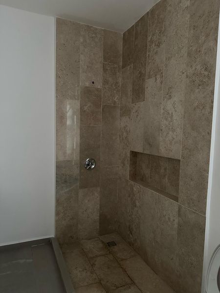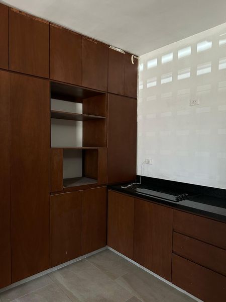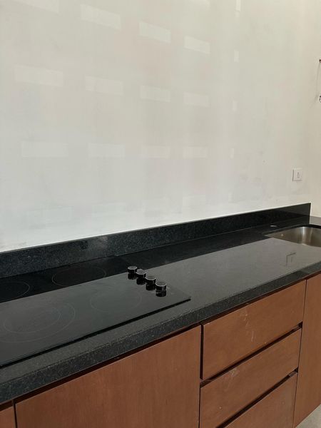 · Cocina con parrilla eléctrica, granito y gavetas inferiores de madera.
