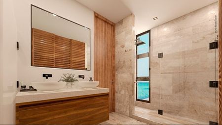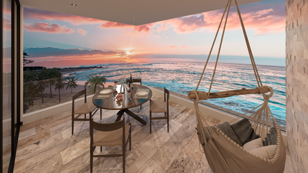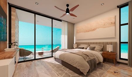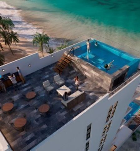 Es un conjunto de departamentos con arquitectura moderna y elegante, situado a la orilla de la playa.
