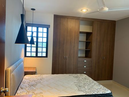 - Cocina integral: campana, alacena con gavetas, cajones, y parrilla eléctrica, refrigerador, horno de microondas.