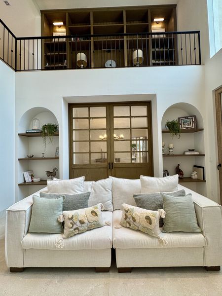 La entrada a la casa tiene una preciosa doble altura que te da la bienvenida y te conecta a una sala que de igual forma tiene una doble altura con un estilo biblioteca en la parte superior. En esta planta también encontrarás un comedor, una amplia cocina con una isla y un family room o recámara de visitas con baño y vestidor completos. Todas estas áreas se conectan a una enorme terraza techada, el jardín y la piscina.