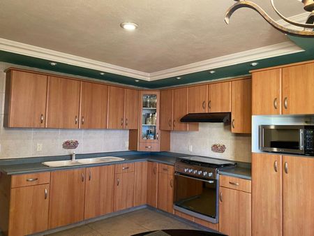 Cocina integral con elegante combinación en madera y tabloide gris oscuro, con amplio espacio de almacenamiento.