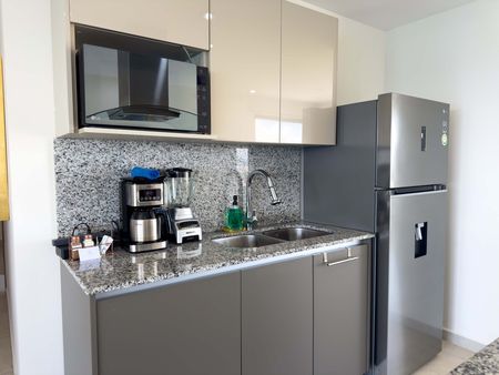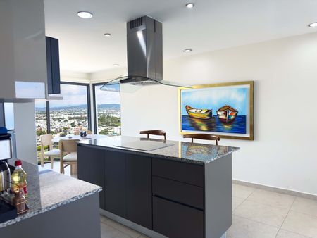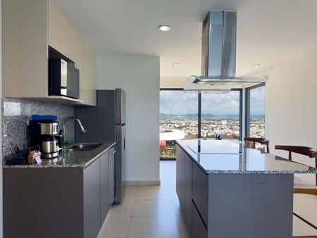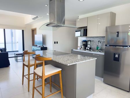 Cocina de vanguardia: Equipada con una isla central con cubierta de granito y estufa de inducción, perfecta para preparar tus platillos favoritos mientras disfrutas de las vistas. Campana extractora de acero inoxidable.