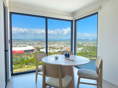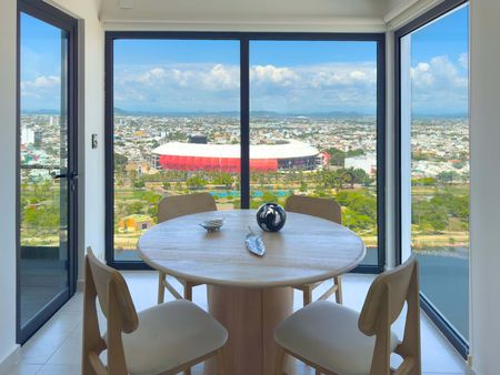 Espacios luminosos: Amplios ventanales que inundan cada rincón con luz natural y ofrecen impresionantes vistas de la ciudad.