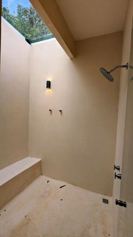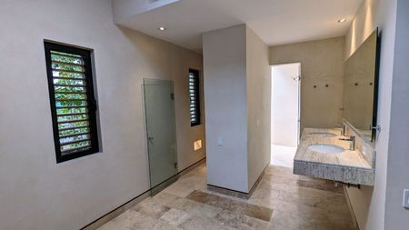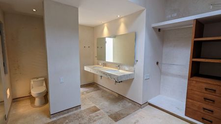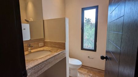- Recámara principal con baño completo y walk-in clóset. El cuarto principal tiene acceso a una terraza y un estanque natural.