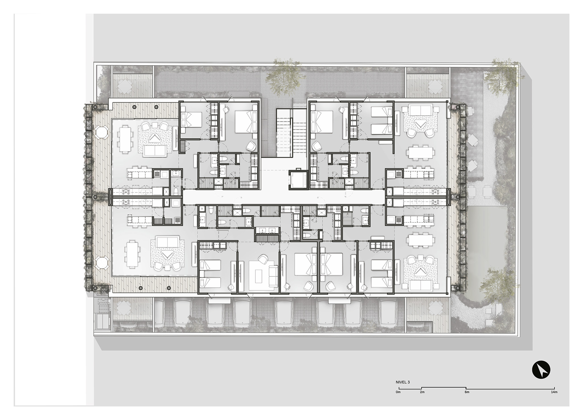 Desarrollo sostenible con cisterna de captación pluvial, paneles solares que reducen el mantenimiento, tecnología LED en todo el edificio. Vegetación en planta baja.