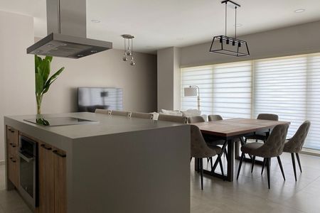 Pisos de 50x100, granito negro San Gabriel en cocina, mármol travertino fiorito en baños, muros de Block con yeso, canceleria línea 3 color bronce, grifería modelo Castel linea Damasco, puertas en triplay de tzalam.