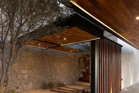 Sala, comedor, cocina y cuarto de servicio, espacio para dos autos, piscina, jardín interior, pasillo de servicio y medio baño de visitas.