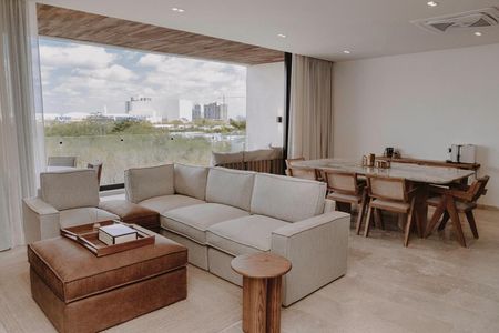 Cuenta con sala comedor, cocina integral equipada, dos recamaras, la principal con baño y walk in closet, la secundaria con closet y baño de visitas.